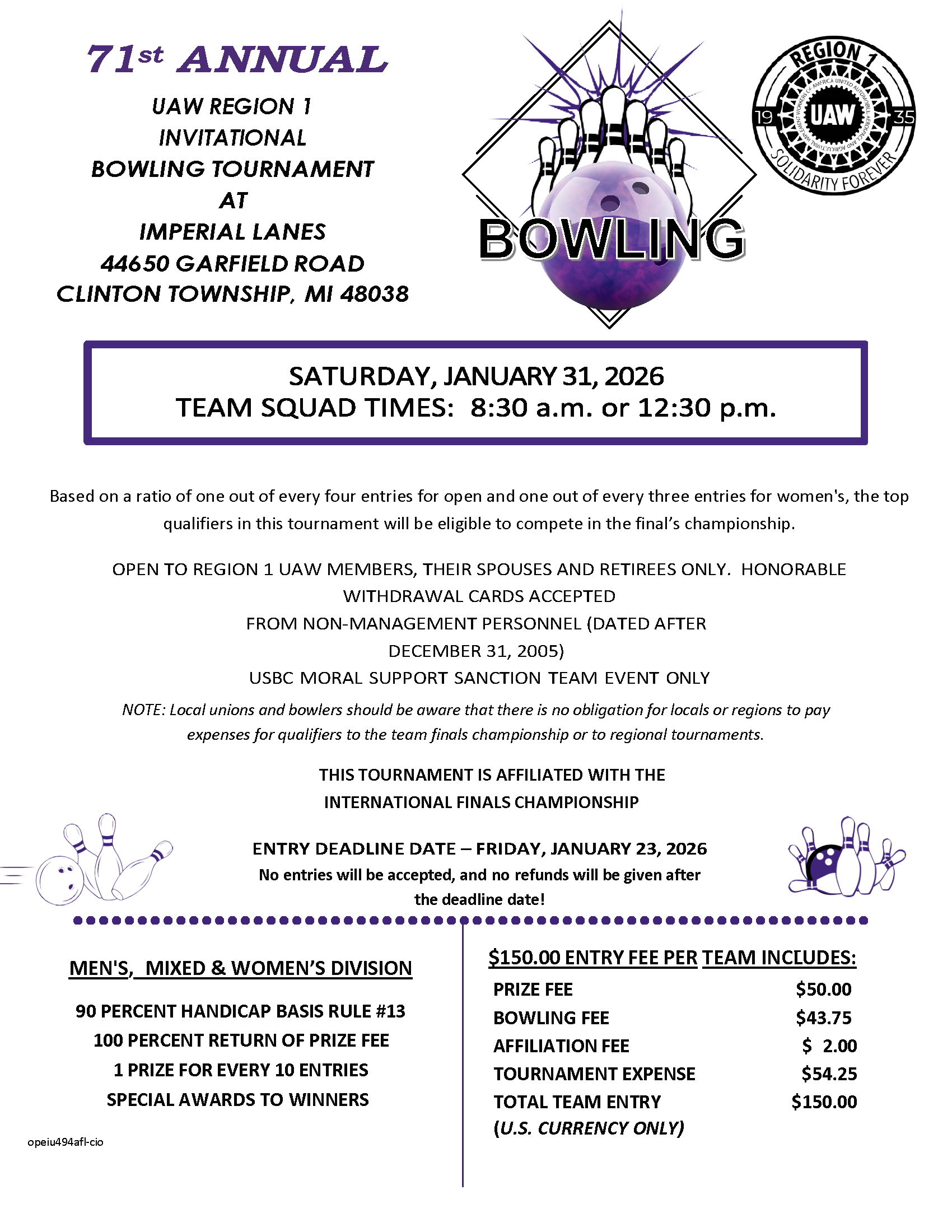The 71st Annual UAW Region 1 Invitational Bowling Tournament is open to Region 1 UAW members, their spouses, and retirees. The tournament features men’s, women’s, and mixed divisions, with team competition, prizes, and special awards. Qualifiers may advance to the finals championship. Entry deadline is Friday, January 23, 2026.