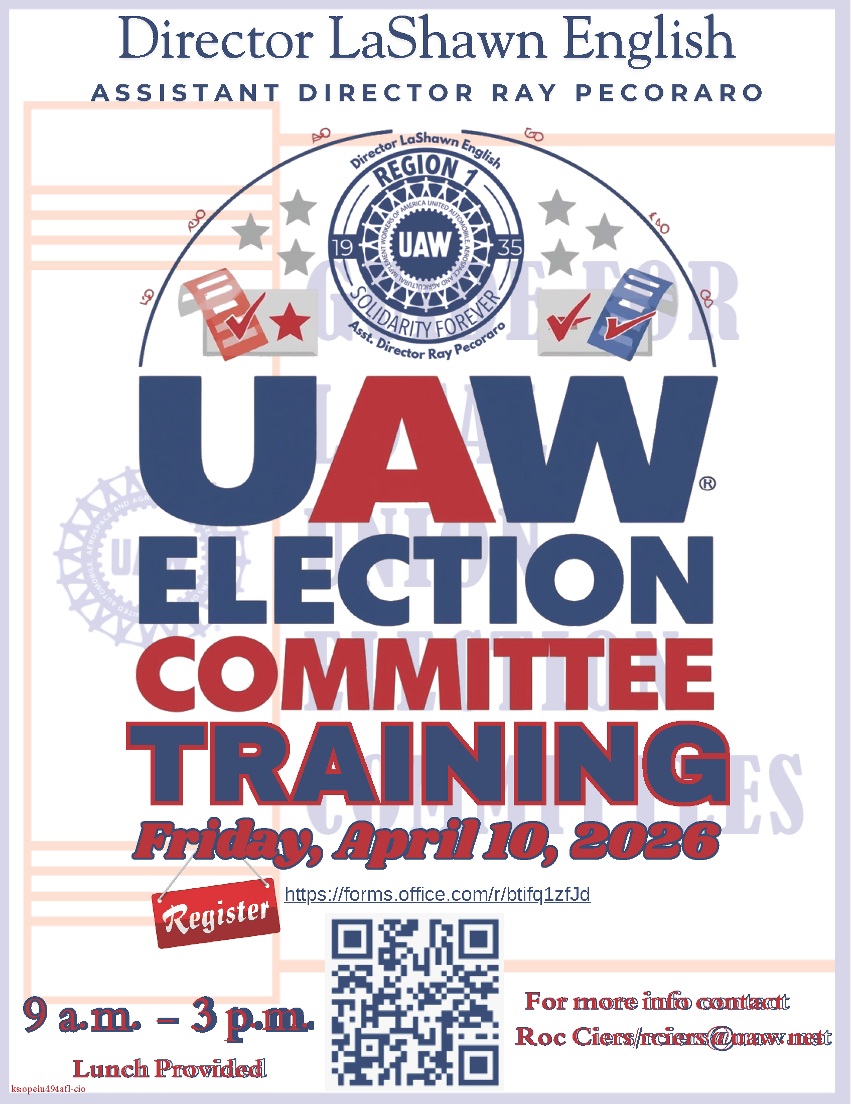 UAW Region 1 is hosting an Election Committee Training designed to prepare members to confidently run fair, accurate, and well-organized union elections. This interactive session covers roles, procedures, and best practices for election committee members. Lunch is provided, and registration is available through the QR code or link on the flyer.
