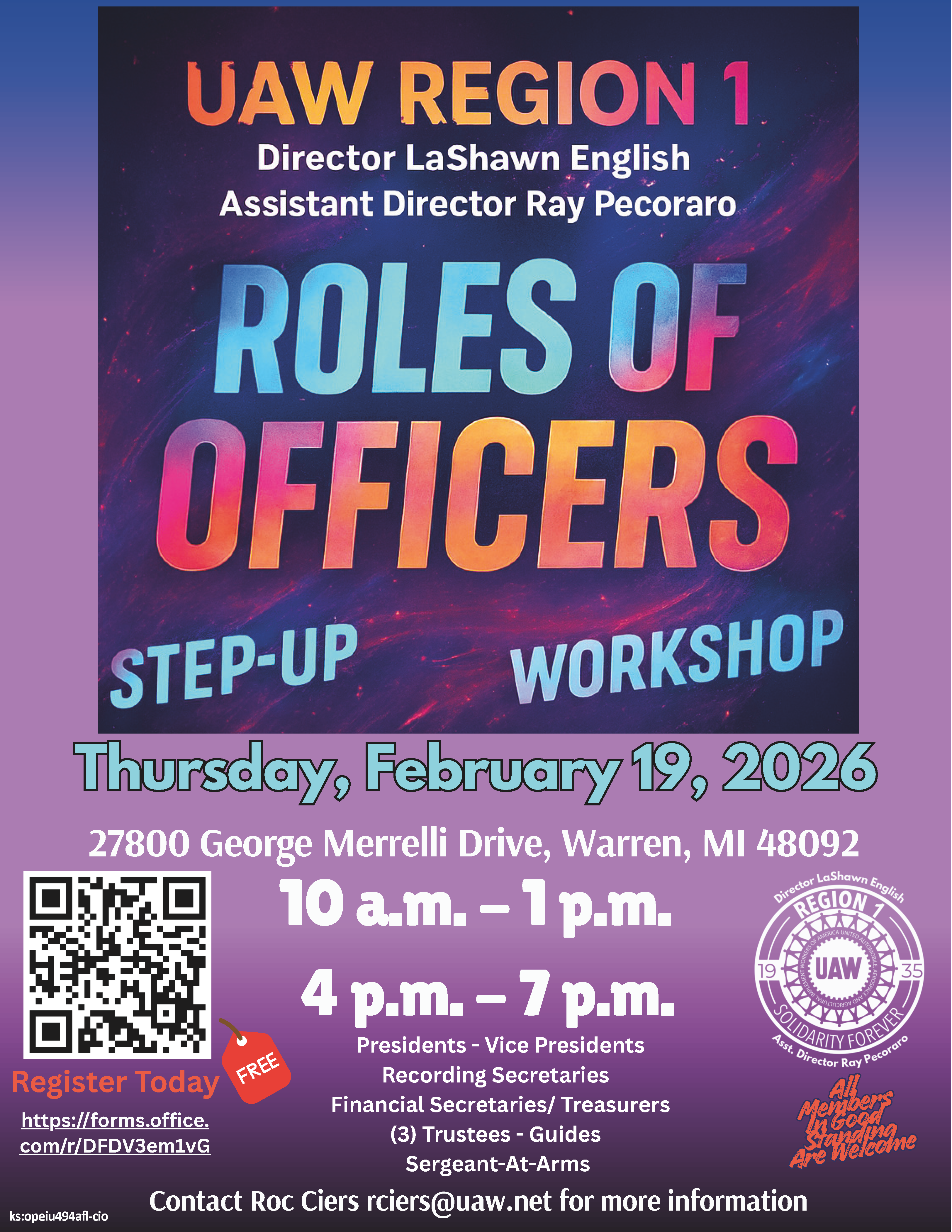 The UAW Region 1 Roles of Officers Step-Up Workshop is a free training designed to help union officers better understand their responsibilities. The workshop covers roles for Presidents, Vice Presidents, Recording Secretaries, Financial Secretaries/Treasurers, Trustees, Guides, and Sergeants-at-Arms.