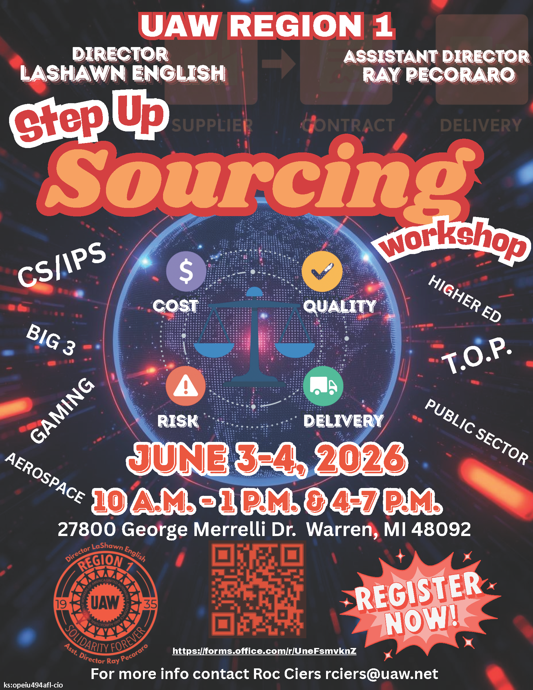 The Step Up Sourcing Workshop, hosted by UAW Region 1, is designed to provide participants with a deeper understanding of sourcing strategies across various industries, including CSIPS, Big 3, Gaming, Aerospace, Higher Ed, T.O.P., and the Public Sector. The workshop focuses on key sourcing principles such as cost, quality, risk, and delivery, helping attendees strengthen their decision-making and strategic planning skills in procurement and supply chain operations. Participants will gain practical knowledge to enhance performance and drive better outcomes in their respective roles.
