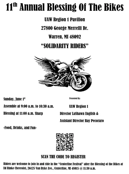 News 11th Annual Region 1 "Blessing of the Bikes" Sunday, June 1st robert delpapa 24 Apr, 2025 Social share icons Document Collection solidarity_riders_2025._call_letter_flyer_-_revised.pdf solidarity_riders_2025._call_letter_flyer_-_revised.pdf