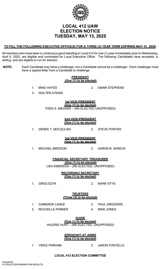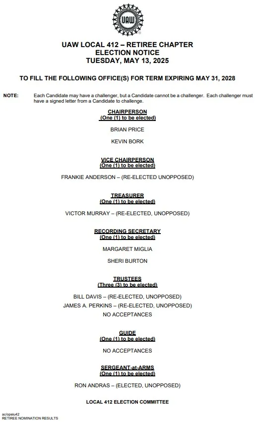 News Local 412 Officer Election Nominees robert delpapa 02 May, 2025 Social share icons Document Collection 412_election_nominations.pdf 412_election_nominations.pdf retiree_nominations.pdf retiree_nominations.pdf 412_election_times_-_locations.pdf 412_election_times_-_locations.pdf