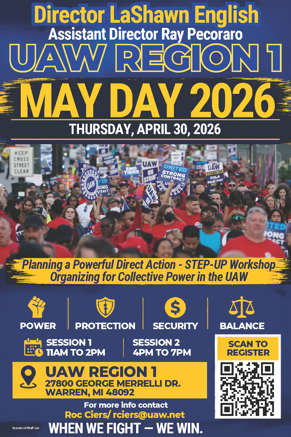 UAW Region 1 will mark May Day 2026 with a powerful day of organizing, education, and collective action on Thursday, April 30, 2026, in Warren, Michigan. The event, led by Director LaShawn English and Assistant Director Ray Pecoraro, is designed to bring union members together to strengthen solidarity and build momentum for worker led initiatives.