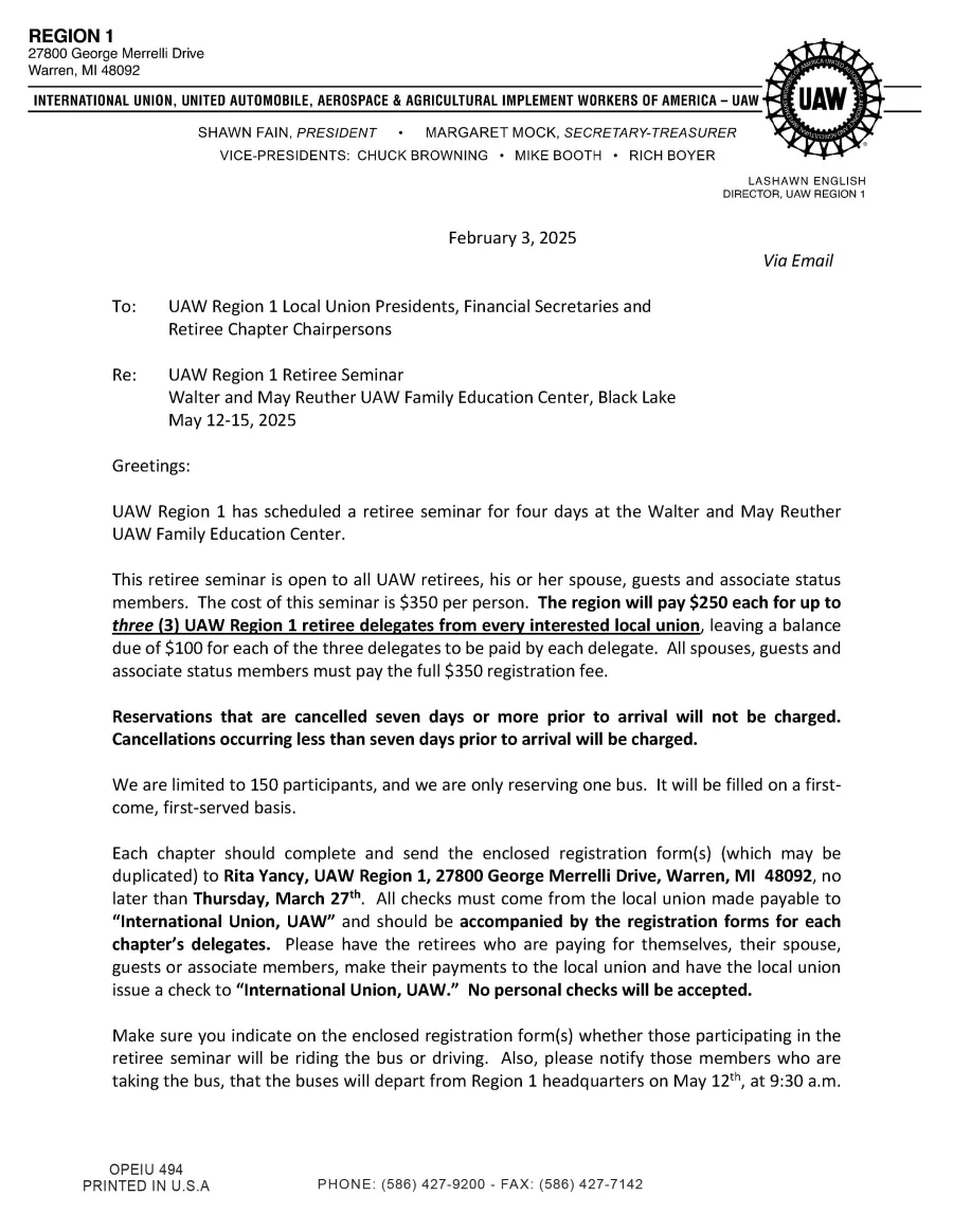 Natalie Hazelton 17 Feb, 2025 Social share icons Retirees, please contact your local union if you are interested in attending. Locals, please share with your retirees.Deadline is March 27, 2025Download and print the call letter and registration forms here: DOCUMENT Region 1 Retiree 2025 Seminar Call Letter Pg 2 Feb 17, 2025 Region 1 Retiree 2025 Seminar Call Letter Pg 2 Region 1 Retiree 2025 Seminar Call Letter Pg 2 DOCUMENT Region 1 Retiree 2025 Seminar Registration Form Feb 17, 2025 Region 1 Retiree 2025 Seminar Registration Form Region 1 Retiree 2025 Seminar Registration Form
