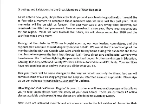 A Message of Thanks from UAW Region 1 Director James Harris