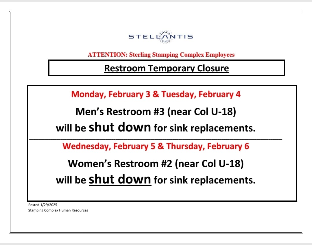 1264 Postings Temporary Restroom Closure - Feb. 3 - 6. Sterling Stamping Admin 03 Feb, 2025 Social share icons Mon, Feb. 3 - 4. Men's restroom #3 ( near Col U-18) will be shut down for sink replacements. Wed., Feb. 5 - 6. Women's Restroom #2 (near Col U-18) will be shut down for sink replacements