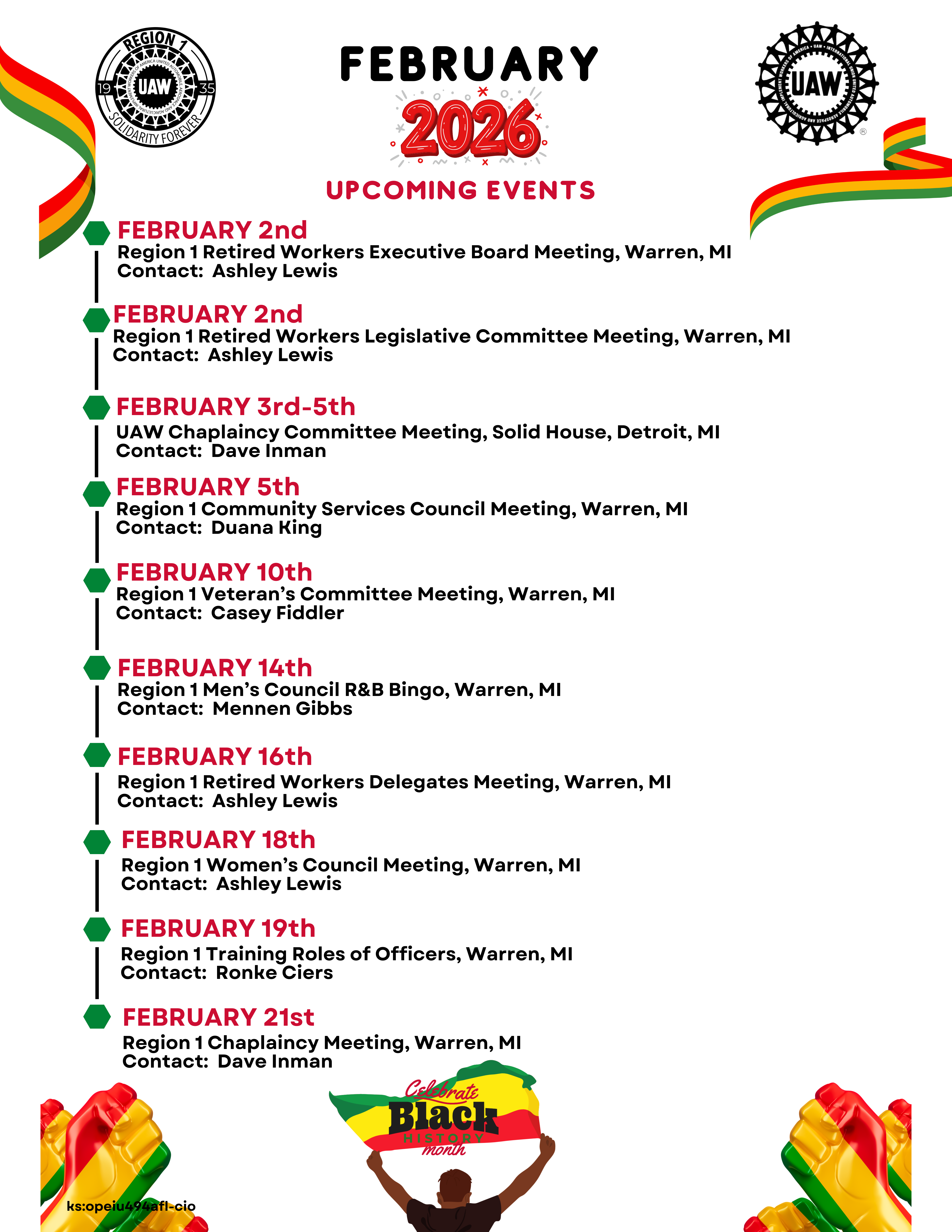 Here is an at a glance look at February's Region 1 happenings! For more information on any of these, call the Local or check for a full communication on the website or UAW Local 2280 Facebook page!